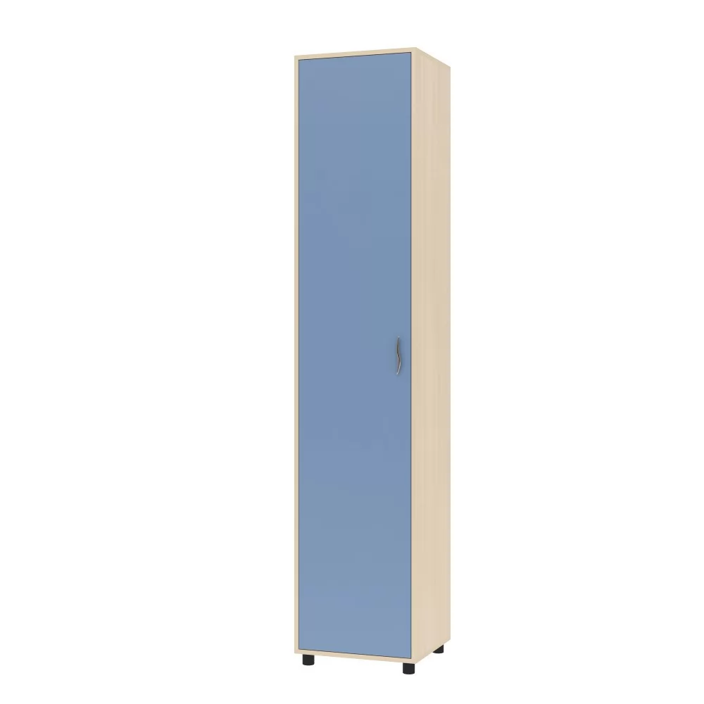 Шкаф однодверный представляет собой красивый и функциональный пенал для хранения личных вещей. Внутри шкафа расположен вертикальный ряд из шести полок. Компактное и удобное, это изделие отлично впишется в уютный интерьер детской комнаты. Шкаф можно собрать с открыванием двери как на правую сторону, так и на левую. Шкаф установлен на регулируемых опорах.