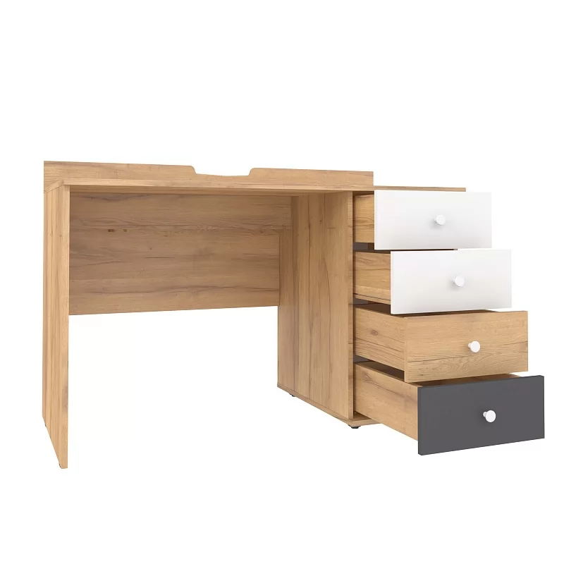 84 Стол письменный отличается нестандартным решением для столешницы, которая максимально адаптирована для потребностей современных детей и работе на компьютере. Под откидной её частью, которая открывается за плавный вырез, прячется ниша для хранения и отверстие с заглушкой для вывода проводов, чтобы они не запутывались и не мешали ребенку. Если ребенок ещё не занимается за компьютером, то нишу можно использовать и для размещения органайзеров с карандашами, фломастерами и красками, чтобы они не отвлекали от творчества. Дополняют стол ящики на шариковых направляющих. За счет просторной рабочей поверхности, а также возможности левосторонней и правосторонней сборки 84 Стол письменный одинаково удобен как для левши, так и для правши. Письменный стол входит в программу Ширина ВРАЗМЕР, а это значит, что его ширину можно увеличивать и уменьшать на 150 мм с шагом в 1 мм. Таким образом, он легко подстроится под планировку вашей комнаты.