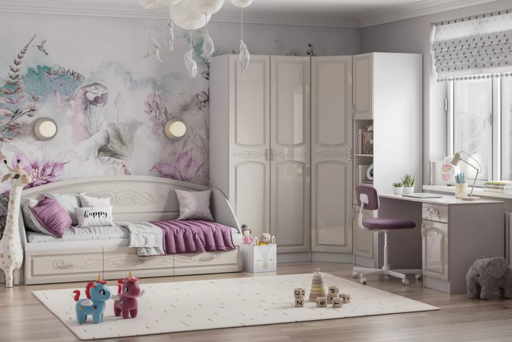 Модульная система Венеция в неоклассическом стиле. Благодаря изысканному рисунку и нежному цвету фасадов комната превращается в прелестный уголок девичьих грез.
