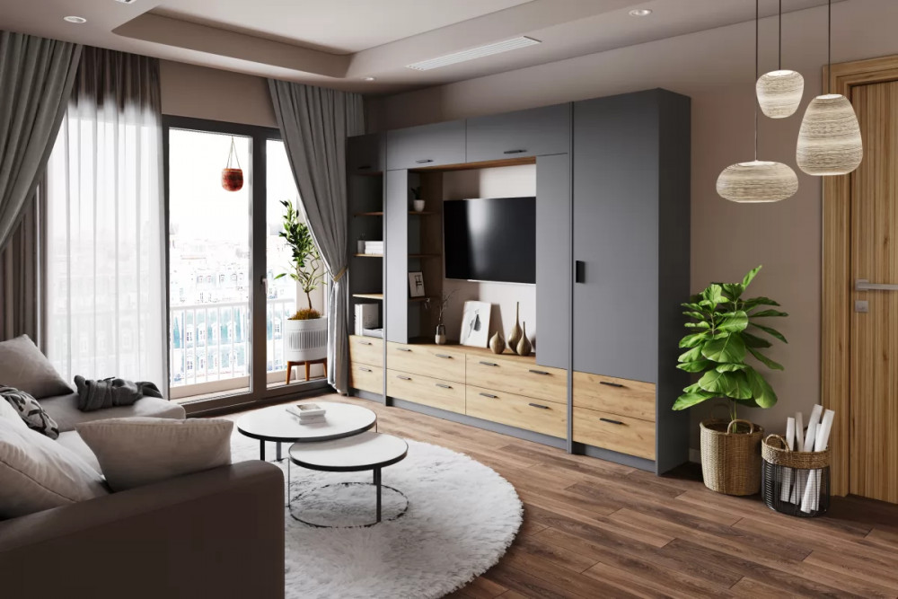 Изюминкой является функциональная стенка. Как правило, такая мебель не украшена крупным броским декором, зато имеет максимальное количество полочек и ящиков и сохраняет свободное