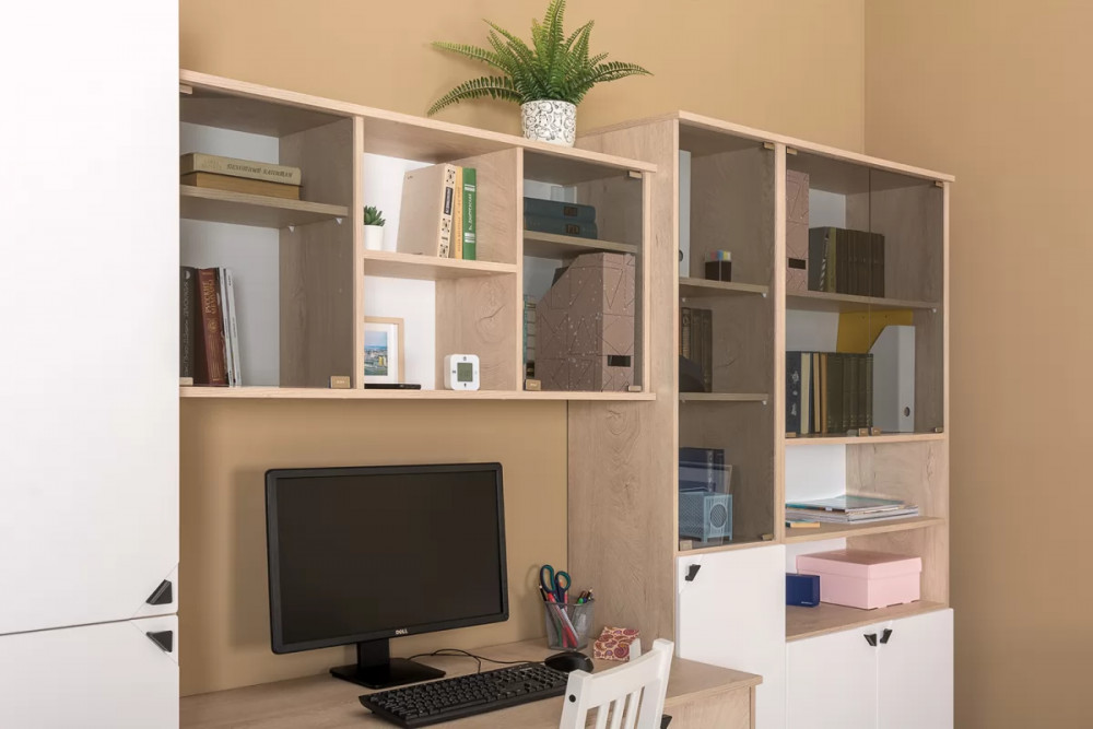 Модульная система Бостон предназначена для организации удобного и функционального рабочего пространства в современных интерьерах. Набор модулей позволяет собирать различные по размеру и стоимости компоновки, способные удовлетворить любой потребительский запрос. Минималистичная лицевая фурнитура выполнена в виде чёрных уголков-треугольников, которые чётко видны на белых фасадах и устанавливаются в специально выполненное углубление. Фасады выполнены из прочного и экологичного МДФ в плёнке ПВХ с тактильно приятным покрытием софт-тач. Витринные створки оформлены серым тонированным стеклом, открываются с помощью толкателей push.