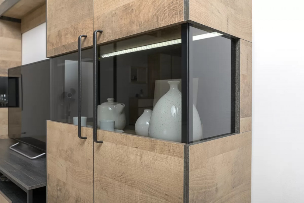 Лицевая фурнитура с тем же покрытием придаёт мебели индустриальную эстетику.