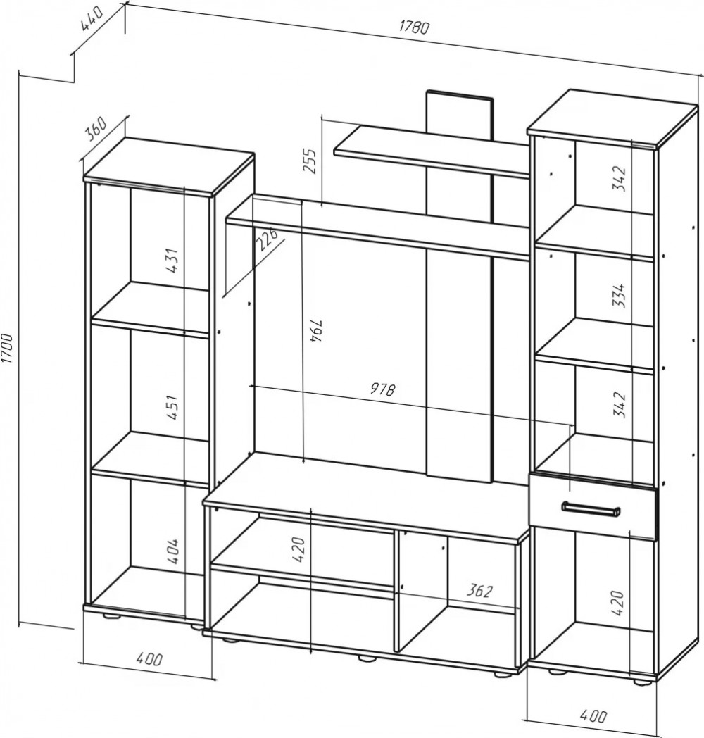 Габариты 1780(Ш) х 440(Г) х 1700(В) мм.