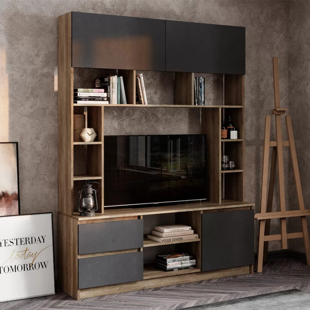 -модель содержит все необходимые зоны для хранения вещей, предметов декора, техники или сувениров, -на столешнице разместиться телевизор, -изделие выполнено из ЛДСП в теплом цвете дуб каньон, а фасады распашных дверок и выкатных ящиков изготовлены в темном цвете, -такое сочетание придает гостиной стиля и делает ее очень современной.