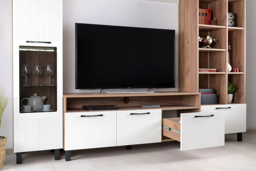 Тумба Манхеттен 13.231 будет отличным дополнением интерьера любой комнаты. Изделие поможет разместить телевизор для более комфортного просмотра новостей, сериалов и различных телепередач. Открытая ниша предназначена для необходимой аппаратуры. А три выдвижных ящика пригодятся для хранения различных вещей и предметов.