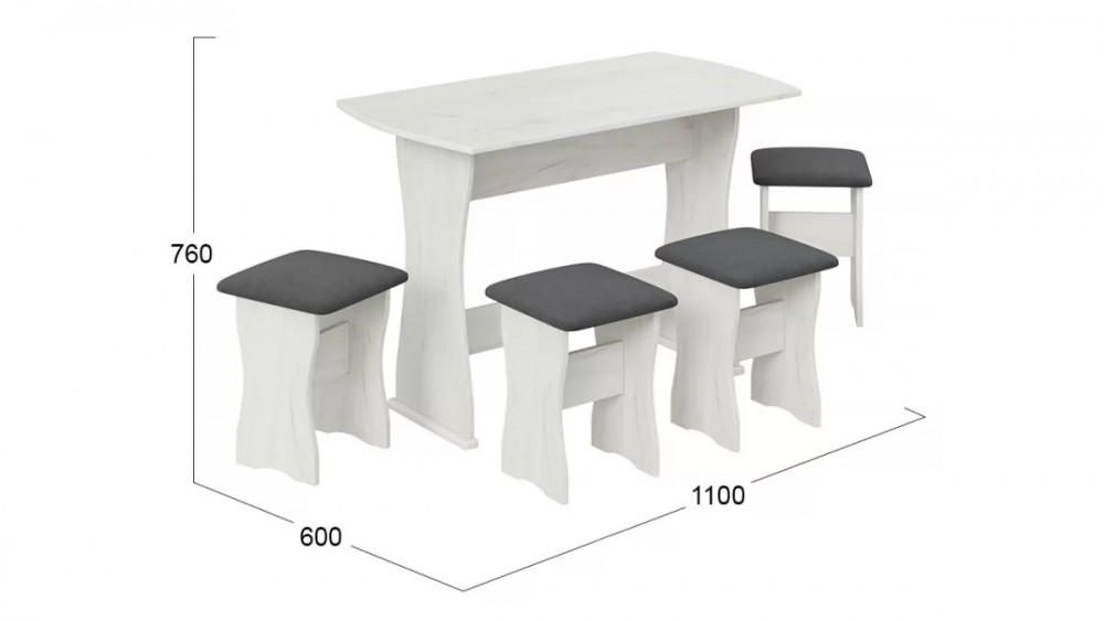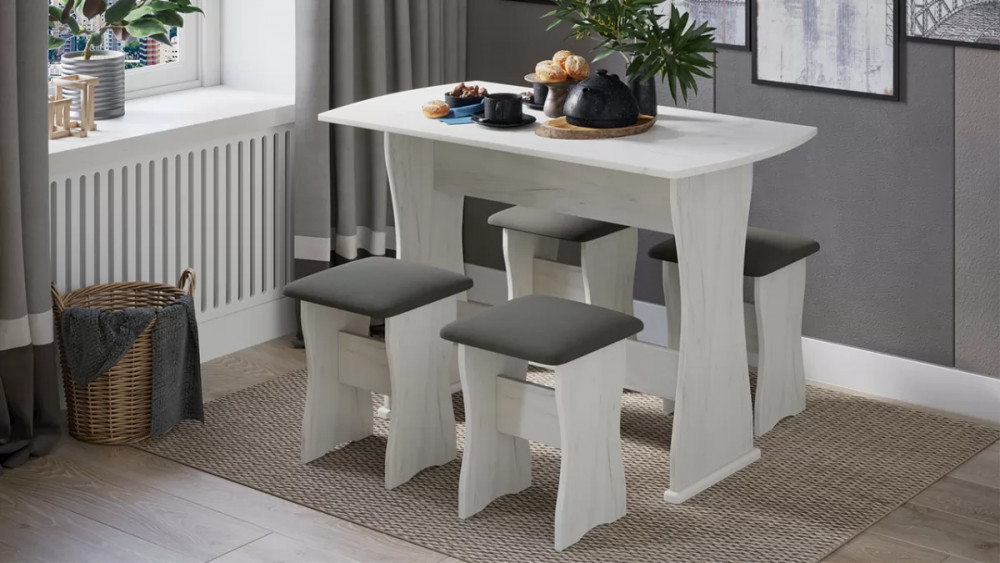 Назначение: Мебель для работы и приема пищи Гарантийный срок: 18 месяцев Комната использования: Кухня Стиль: Современный Габаритная длина: 1 100 Тип: Обеденная группа Расположение: Напольный Материал каркаса: ЛДСП Размеры стола: 1100х600х760 Дополнительная информация: Комплектация : стол + 4 табурета, материал мягкого сидения - кожзам. Производство: Россия Габаритная ширина: 600 Габаритная высота: 760 Размеры табуретов: 340х340х430 Срок службы: 5 лет Оттенок: Платиновый, Серый Цвет: Дуб крафт белый/Велюр серый Обивочный материал: Велюр Цвет каркаса: Дуб крафт белый Оттенок каркаса: Платиновый Оттенок обивки: Серый Цвет обивки: Велюр серый Материал столешницы: ЛДСП Заглушина для ящика кровати в комплекте: Нет Наличие механизма раскладки: Нет Наличие спального места: Нет