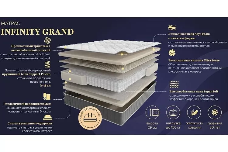 Матрас INFINITY GRAND 900*2000мм (Пена/лен, ср.жесткий, h 29см) в Ишиме