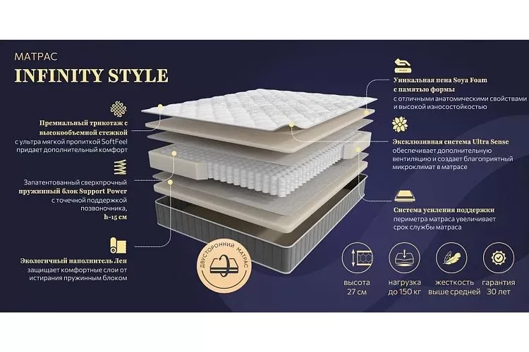 Матрас INFINITY STYLE 1800*2000мм (Пена/лен, жесткий, h 27см) в Ишиме