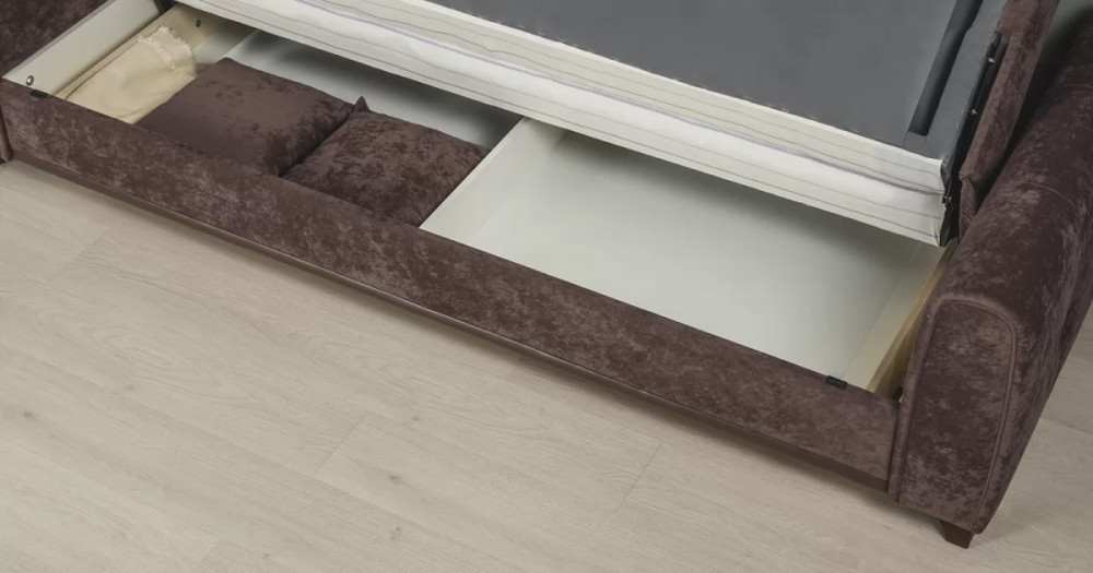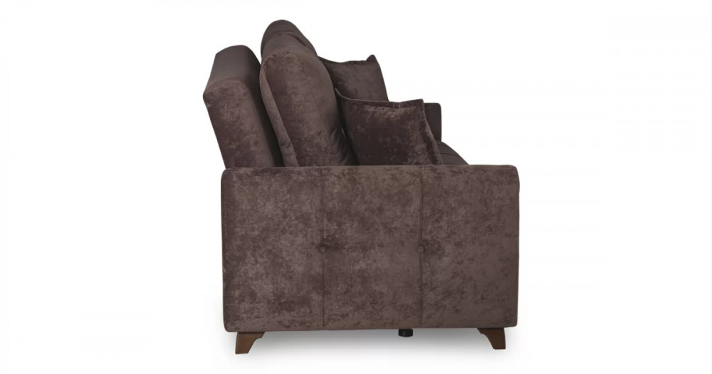 Материалыосновная ткань: Романс (велюр) / Марвел (кож.зам)выполняется в тканях: Романс ява (тёмно-фиолетовый), Марвел шоколад (шоколадный)каркас: фанера деревянный брус ДСП ЛДСП ДВПооснование матраса: ППУ на блоке плоских пружин "змейка"приспинные подушки, шт: 2съемные чехлы приспинных подушек: естьдекоративные подушки, шт: 2наполнитель подушек: крошка поролона и полиэфирное волокноматериал опор: пластикцвет опор: коричневыйвысота опор (мм): 80Бельевой ящикестьс перегородкой по центру (2 отделения)размер отделения (Д x Ш, мм): 890 x 840 x 200Требуется ли сборкадаУпаковкаколичество коробок, шт: 2общий вес с упаковкой, кг: 82,4Гарантия: 18 месяцевГабаритысложенный (Д x Г х В, мм): 2340 x 1050 x 910разложенный (Д x Г х В, мм): 2340 x 1310 x 600спальное место (Д x Ш, мм): 1950 x 1310высота посадки (мм): 470глубина сиденья (мм): 500высота спинки (мм): 540высота подлокотника от сиденья (мм): 180максимально допустимая нагрузка: 80 кг на одно посадочное место, 100 кг на одно спальное местоМеханизм трансформацииКнижка с 0 стенойБельевой ящикестьс перегородкой по центру (2 отделения)размер отделения (Д x Ш, мм): 890 x 840 x 200Декорзащипы на подушках и подлокотниках с утяжкой на 2 пуговицы из осн. материала, защипы на сидушке, декоративный кант на передних торцах подлокотников