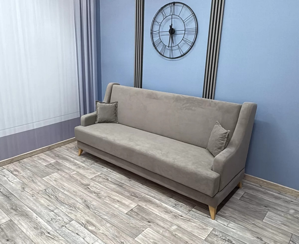 Спальное место дивана основано на пружинных блоках, соединенных между собой механизмом раскладки «Книжка». Имеется вместительный короб для бельевых принадлежностей. Съемные подлокотники упрощают процесс транспортировки.