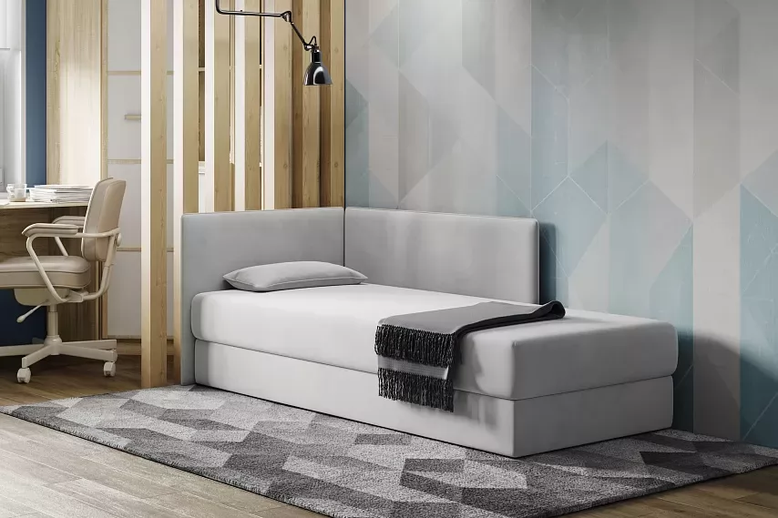 Тахта MIA — многофункциональная модель с двумя мягкими спинками, формирующими угол. Современный дизайн и качественное исполнение позволяют сделать ее уголком уюта как в спальне, так и в гостиной. Тахта оборудована односторонним несъемным матрасом с пружинным подъемным механизмом и вместительным ящиком для белья, что экономит пространство и идеально подходит для хранения различных вещей.