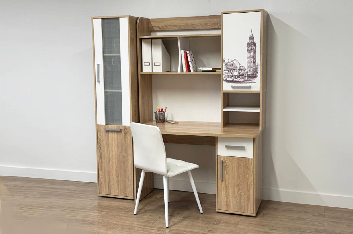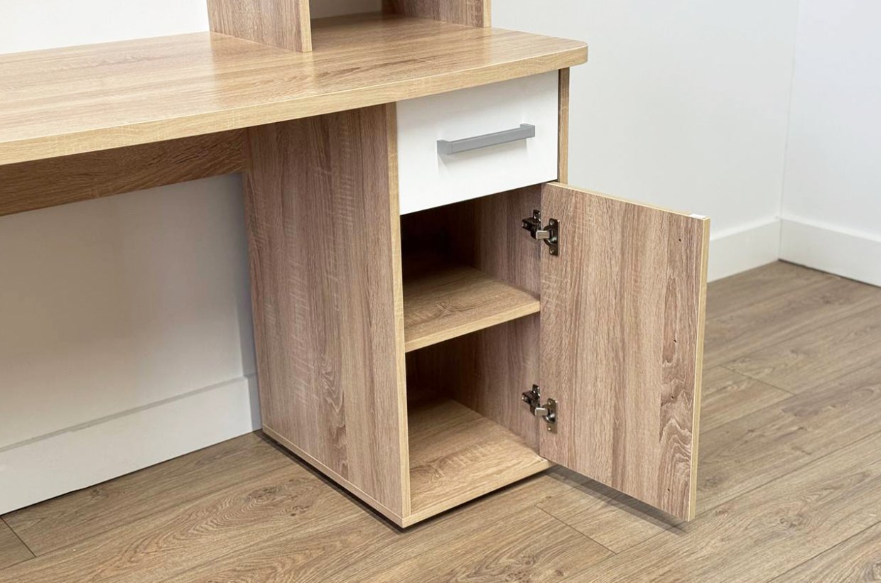 Стол выполнен из качественного материала ЛДСП в цвете дуб сонома с белыми элементами. Особенностью дизайна являются радиусные элементы и утолщенная столешница толщиной 25 мм. Для расширения функциональности стола рекомендуется дополнить его надстройкой и стеллажом из той же серии Лайт-1.