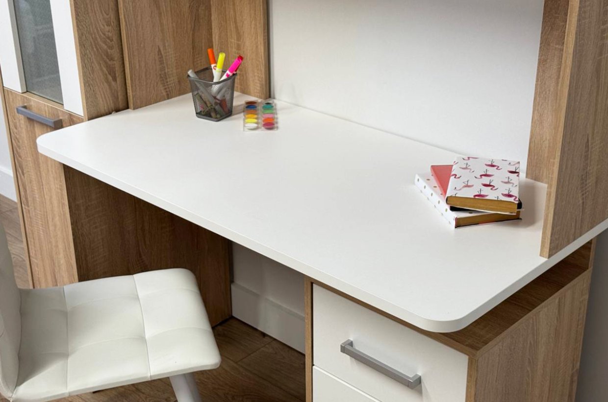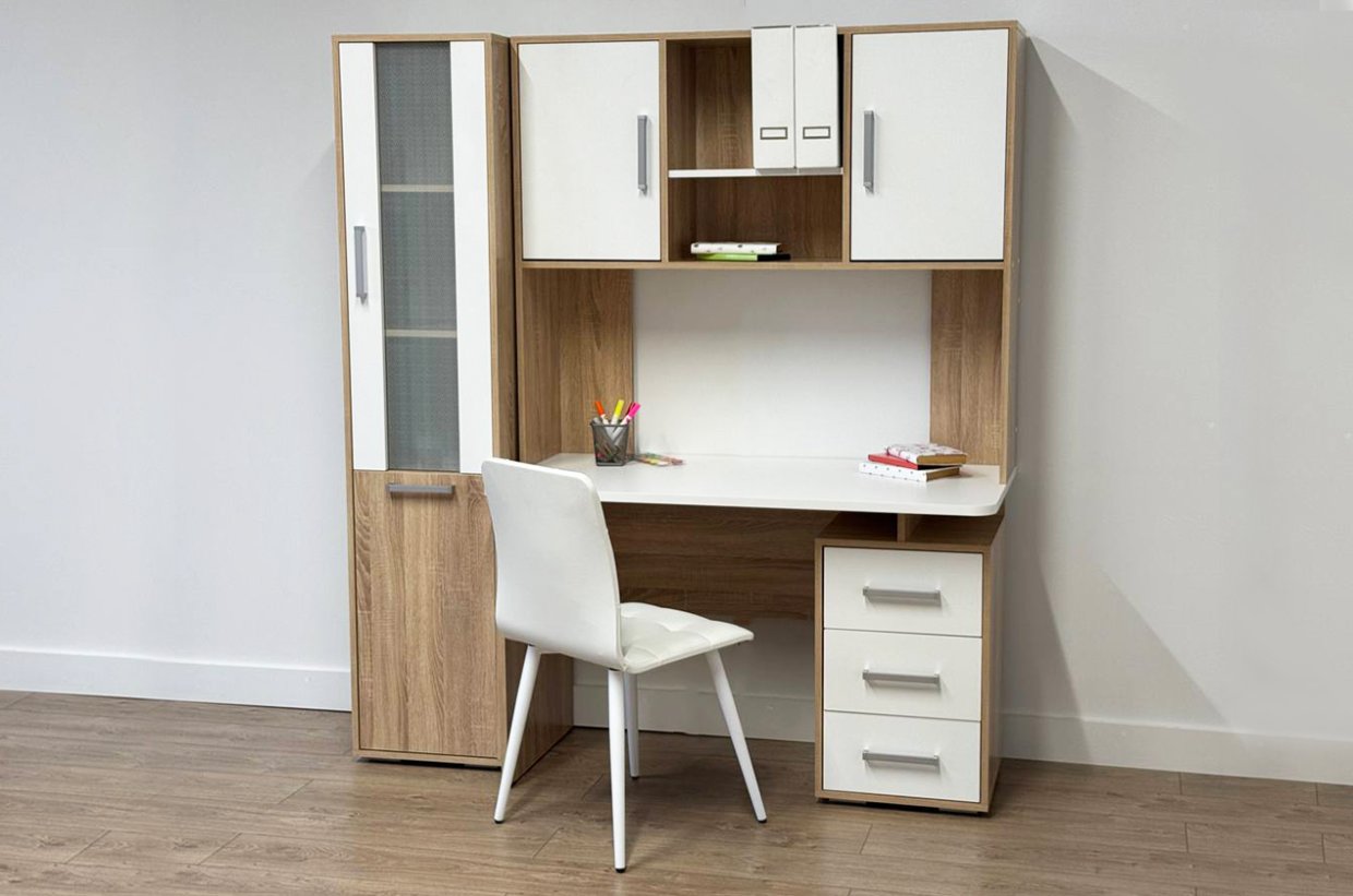 Компьютерный стол Лайт – компактная, удобная модель мебели, которая поможет обустроить комфортабельное рабочее место и в офисе, и дома, отлично подойдет для организации рабочей зоны для школьников средних и старших классов. Лаконичный компьютерный стол Лайт в {{in_city}} выполнен в пастельных светлых тонах, сочетание оттенков цветов придает ему объема и делает оригинальной деталью интерьера. При своей компактности, он достаточно вместителен за счет наличия встроенной тумбы и трех выдвижных ящиков, на утолщенной и прочной столешнице легко можно установить и ноутбук, и компьютер, может быть укомплектован стеллажом и надстройкой с полками.