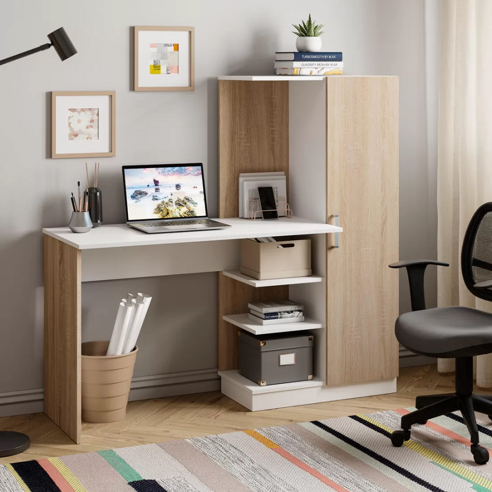 -модель сделана из ЛДСП двух цветов – белого и сонома, -благодаря такому цветовому решению, изделие будет выигрышно смотреться в любом интерьере, -конструкция модели представляет собой вместительную столешницу, зону с открытыми полками, -небольшой пенал с распашной дверцей, в котором можно хранить необходимые для занятий вещи.
