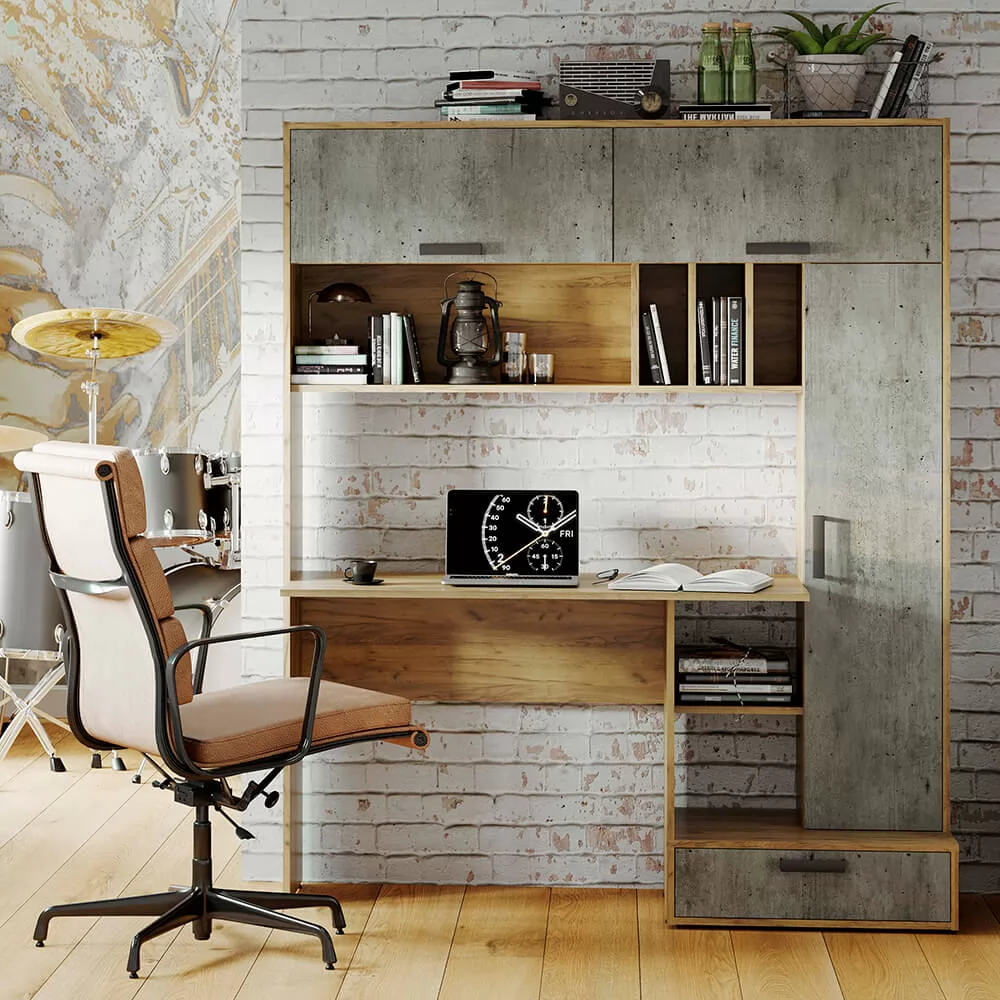 -в комплектацию входит столешница, верхние и боковые ниши, спрятанные за дверцы, нижний выдвижной ящик и открытые полки, -разместить необходимые предметы, включая технику, не составит труда, -цветовое решение позволит модели вписаться в современный интерьер, особенно в стиле лофт.