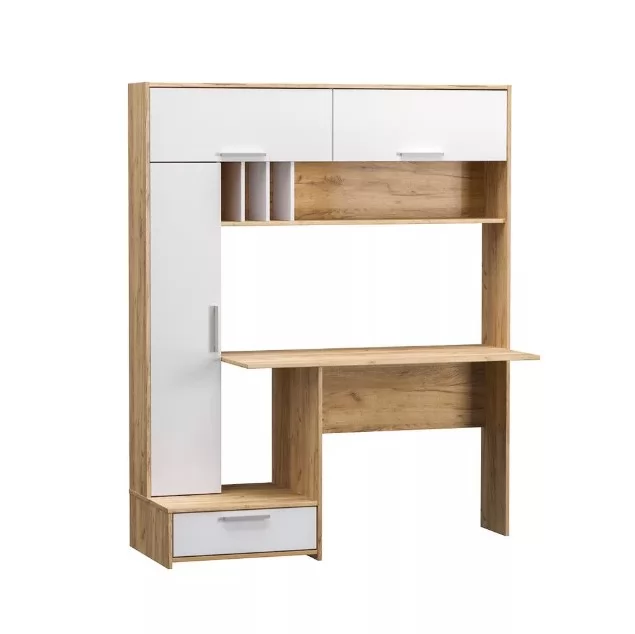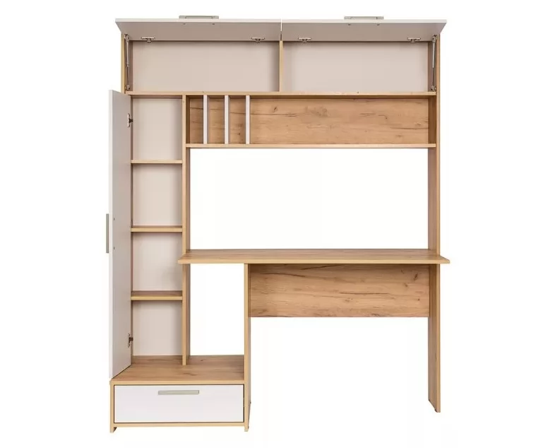 Рабочий стол отлично подойдет для комнаты школьника или организации домашнего офиса. Современный дизайн конструкции прекрасно впишется в интерьер любой комнаты. На широкой столешнице можно свободно разместить ноутбук, настольную лампу и письменные принадлежности. Богатая система хранения позволит содержать рабочее место в чистоте и порядке. Конструкция состоит из закрытого вертикального блока с тремя полками, выдвижного ящика и двух объемных ниш с откидными дверцами. Дополнительно в систему включена большая открытая полка с отсеками для документов.