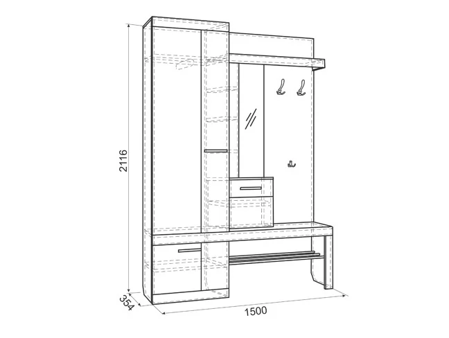 Состоит из крючки для одежды, обувницы, открытой ниши для обуви, открытых полок, зеркала, полки для головных уборов, выдвижного ящика, шкафа для одежды.