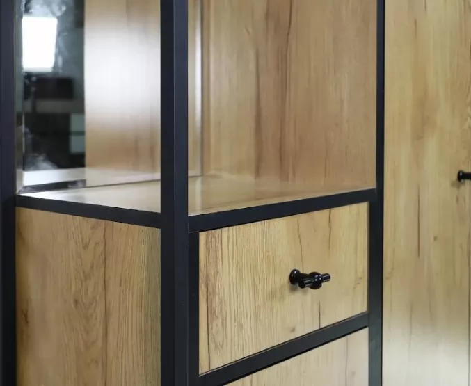 Прихожая «Берген 5» состоит из 2-х створчатого шкафа с выкатной штангой, атакже двух выкатных ящиков и зеркала с фацетом.