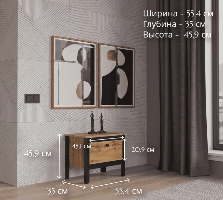 Модель выполнена из ЛДСП и проста в уходе. Достаточно протереть поверхность от пыли сухой тканью или слегка влажной тряпкой при устойчивых загрязнениях. Сочетание черного матового и древесного цветов делают этот модуль отличным решением для современных интерьеров.