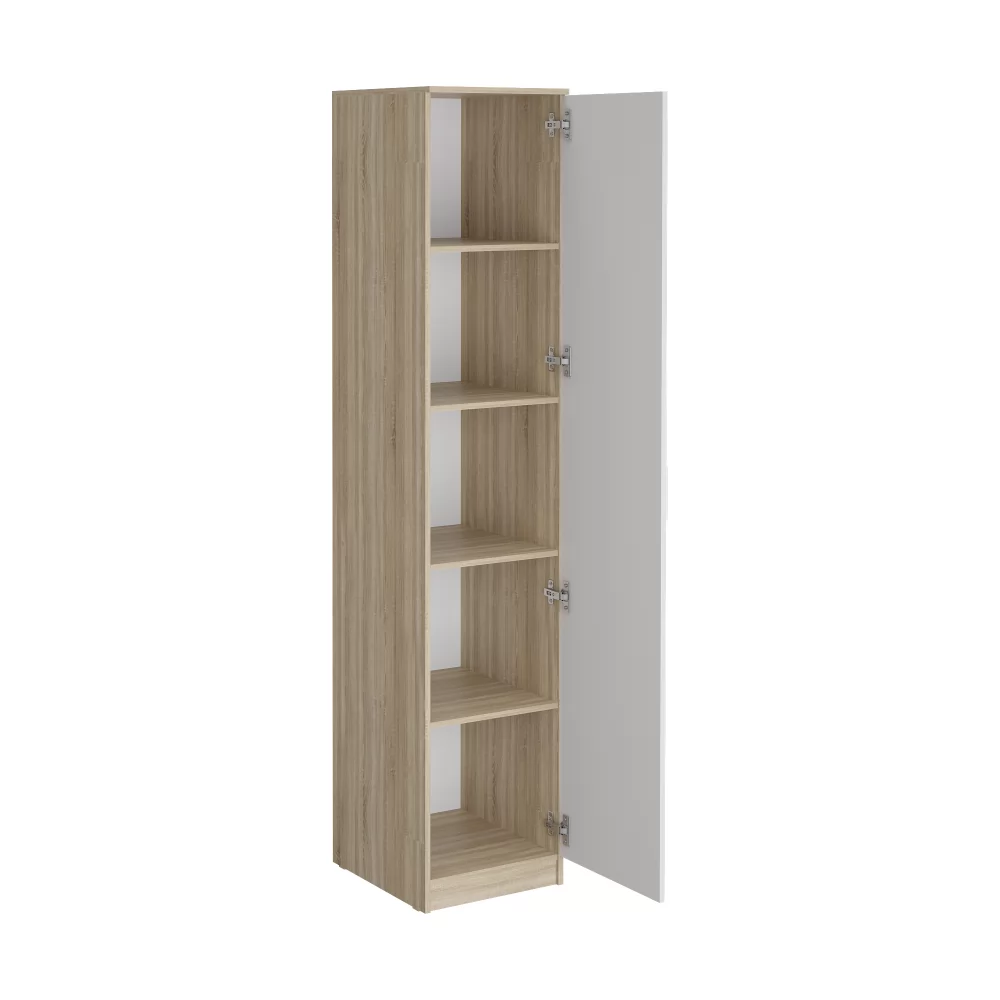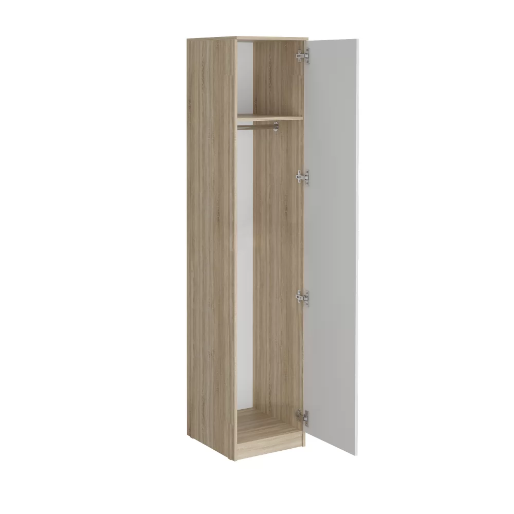 Универсальный пенал с полками и штангой - можно установить все полки и использовать для хозяйственных вещей,можно совместить - и удалив несколько верхних полок, применить штангу для вешалок с короткими вещами или же сделать полностью гардеробный пенал для длинных вещей на плечиках - уставив только верхнюю и нижнюю полку.
