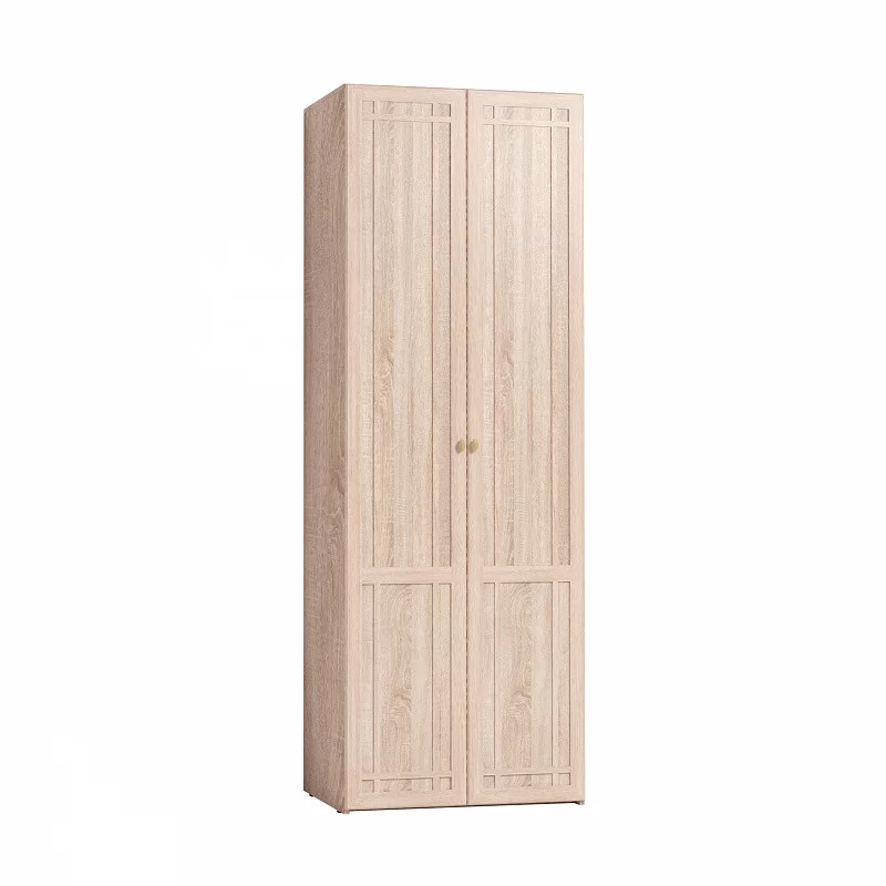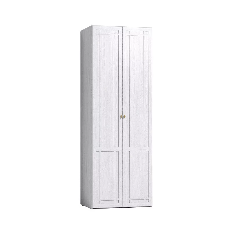 Шкаф с распашными глухими фасадами, декорированными раскладкой из профиля МДФ. Глубина шкафа в 579 мм позволяет комплектовать шкаф стационарной штангой длиной 757 мм. На ней можно разместить более 10 плечиков с верхней одеждой. Нижняя полка размещается на высоте 290 мм от нижнего щита, рационально организуя нижнее свободное пространство шкафа.