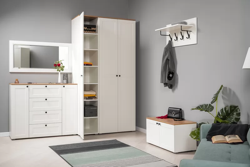 Прихожая доступна в двух цветовых решениях – белый/графит в сочетании с теплым древесным декором.