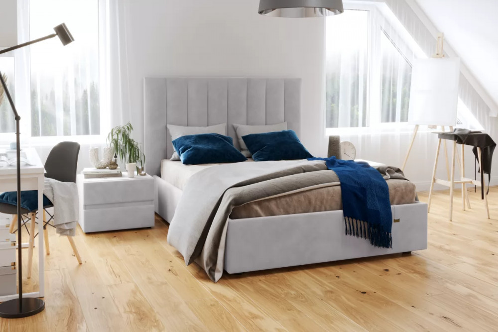 Кровать «Ingrid» подойдет для современных интерьеров спален, впишется в стиль ретро и скандинавский минимализм. Обивка будет отлично сочетаться с любыми цветовыми оттенками отделки и мебели. Кровати выполнены в нейтральных и ярких тканях велюр, что позволяет подобрать подходящий вариант почти под любой интерьер. Изголовье имеет прямоугольную форму, повторяя очертания кровати. Дизайн модели отличается высоким изголовьем с вертикальными строчками и углублениями.