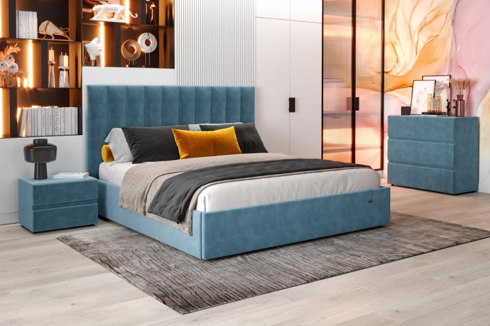 Кровать «Ingrid» подойдет для современных интерьеров спален, впишется в стиль ретро и скандинавский минимализм. Обивка будет отлично сочетаться с любыми цветовыми оттенками отделки и мебели. Кровати выполнены в нейтральных и ярких тканях велюр, что позволяет подобрать подходящий вариант почти под любой интерьер. Изголовье имеет прямоугольную форму, повторяя очертания кровати. Дизайн модели отличается высоким изголовьем с вертикальными строчками и углублениями.