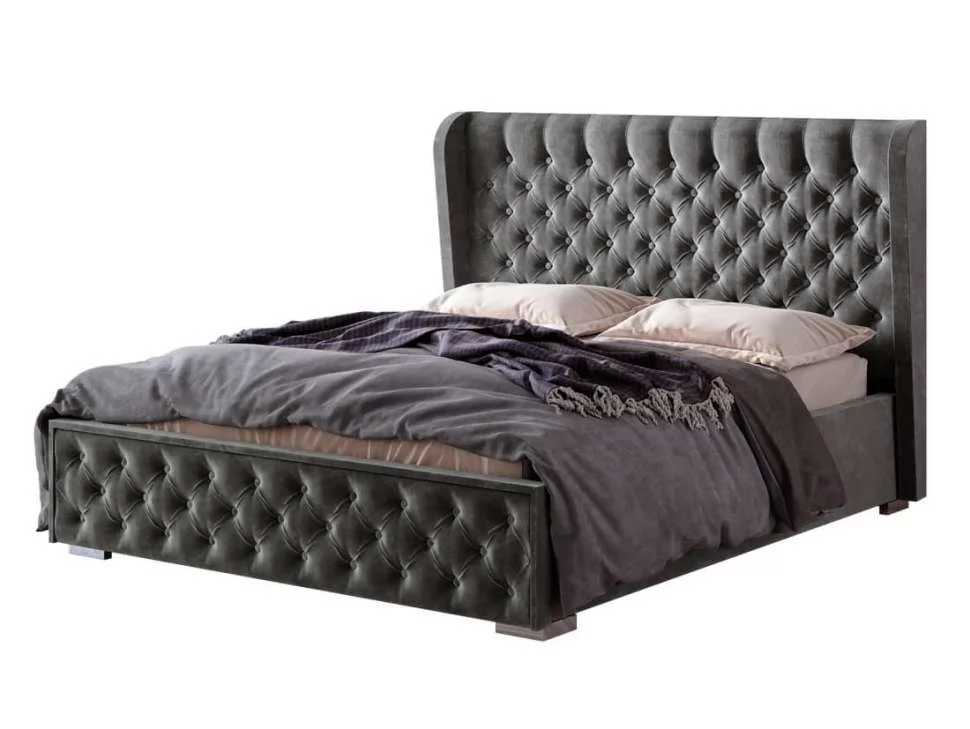 -корпус изделия выполнен из ЛДСП высокого качества, -в дизайне модели используется велюр приятного цвета графит, -высокое мягкое изголовье имеет декоративную стяжку с пуговицами, такой прием придает кровати элегантности.