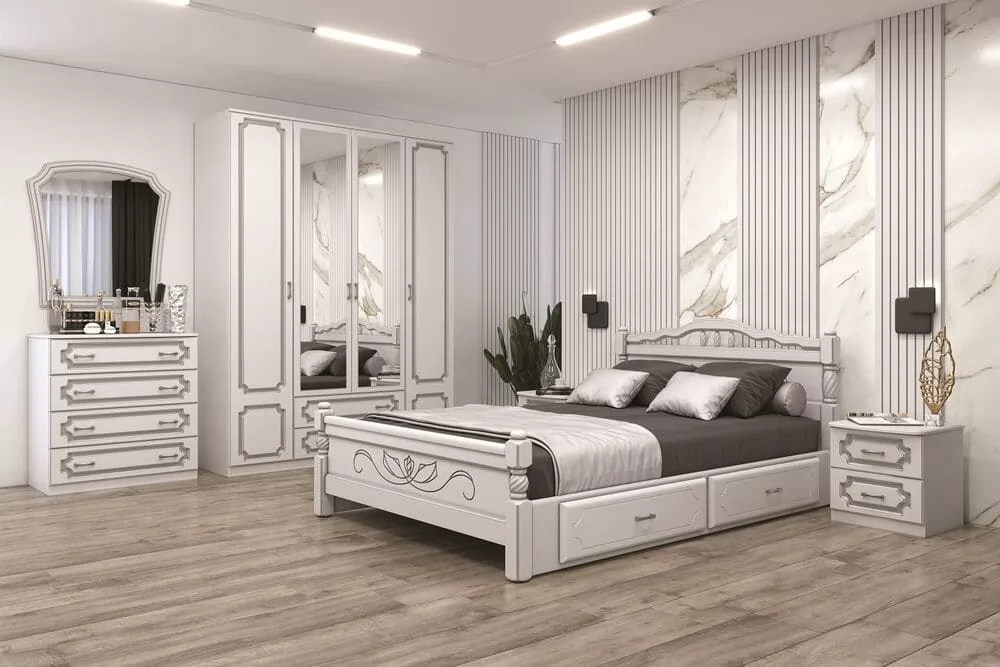 Белоснежность фасадов, элегантная отделка рисунком, классический распашной шкаф с зеркалом - так выглядит идеальная спальня. Нежный оттенок белого жемчуга делает комнату более просторной и светлой - универсальный вариант для любого стиля.