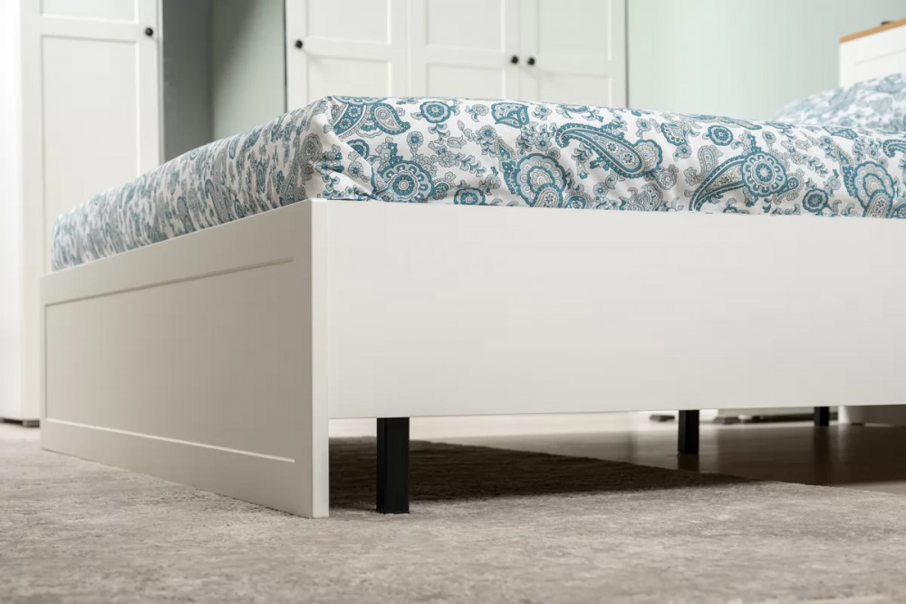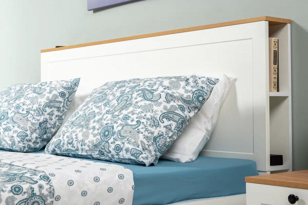 В изголовье кровати предусмотрены вместительные ниши. Шкафная группа полноценной глубины позволяет эффективно организовать систему хранения.