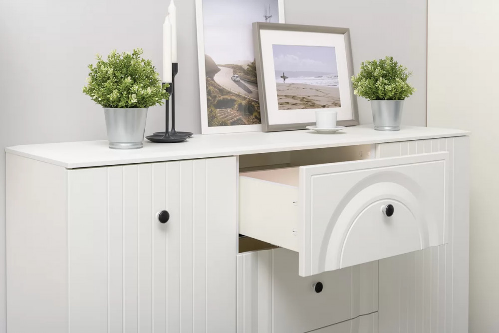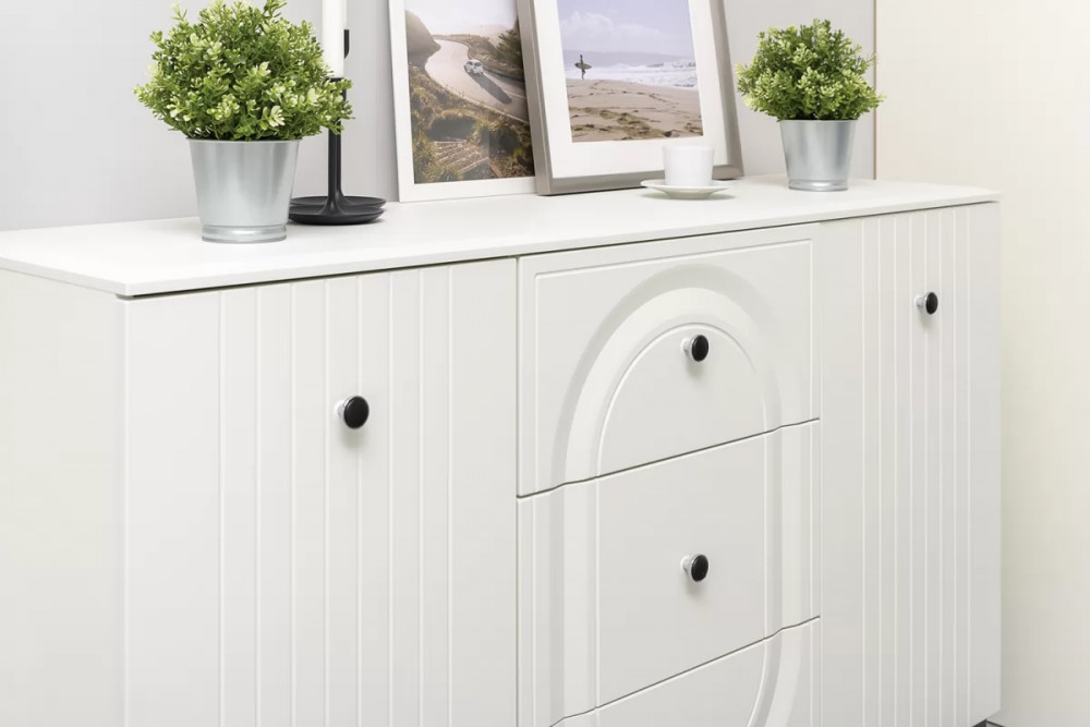 Вся лицевая фурнитура металлическая, графичное и стильное сочетание черного и хромированных деталей эффектно расставляет акценты на мебели.