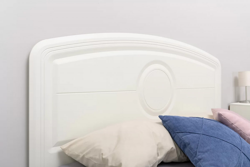 Основным декоративным элементом коллекции является круг. Явно представленный фрезеровкой по фасадам тумбы, комода, в изголовье кровати и ручках-кнопках.