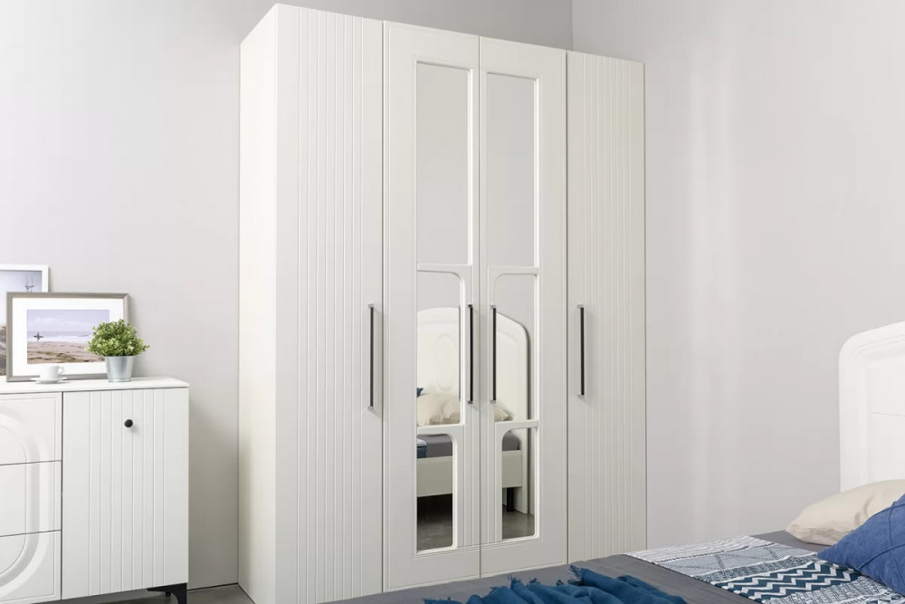 Нестандартно и интересно решён декор двустворчатого шкафа. Зеркало накладывается изнутри фасада, проявляя таким образом сквозную ажурную фрезеровку.