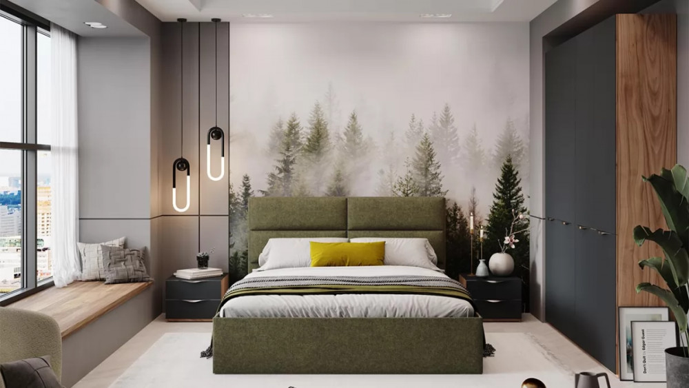Спальный гарнитур «Глосс» №10 Яблоня Беллуно, Стекло Графит матовый, Микровелюр Jercy Deep Green в Ишиме