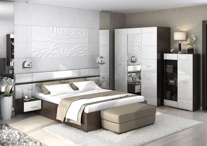 Модули спальни "Вегас" отличаются элегантностью и функциональностью. Стильный спальный гарнитур с мягкими формами и глянцевыми фасадами станет отличным дополнением к вашему интерьеру.    В комплект спальни входит: