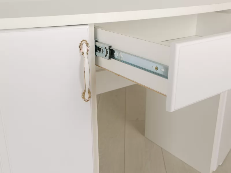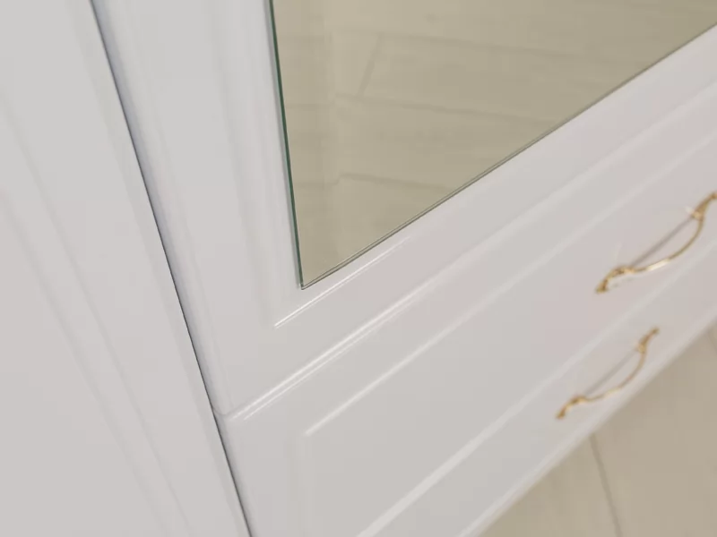 Модульная серия «Виктория» выполнена в стиле «Классика». Особенность серии - фасады МДФ с фрезеровкой, петли с доводчиком на всех фасадах, шариковые направляющие, возможность исполнения шкафов для одежды с зеркалами и без. Ручки металлические с белой вставкой, покрытие золото.