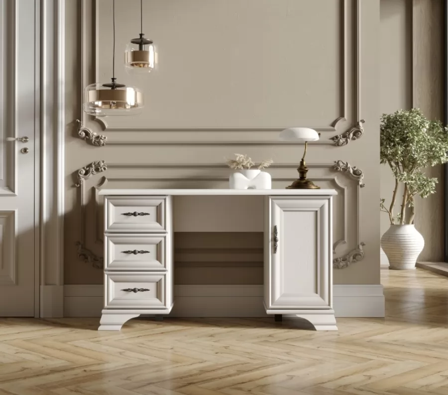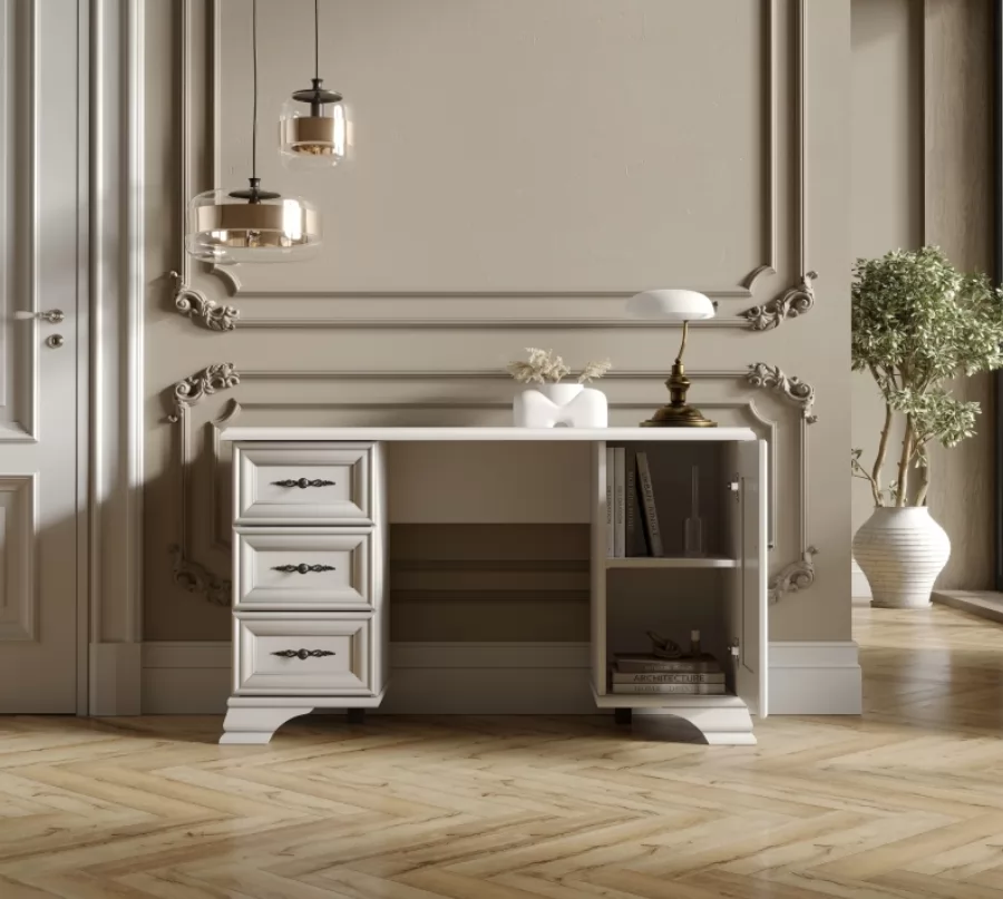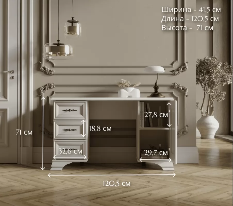 Столик стоит на изящных резных ножках, которые подчеркивают классический дизайн. Витиеватые ручки удачно дополняют фасад и привлекают внимание к деталям.