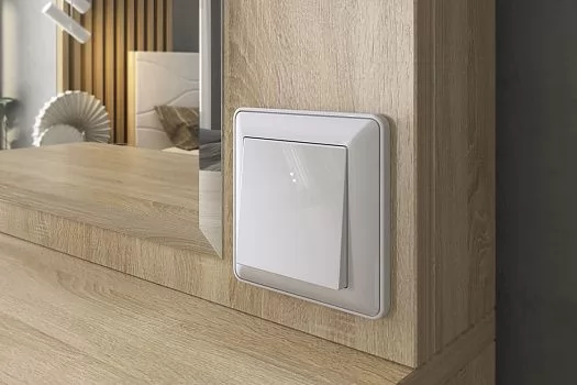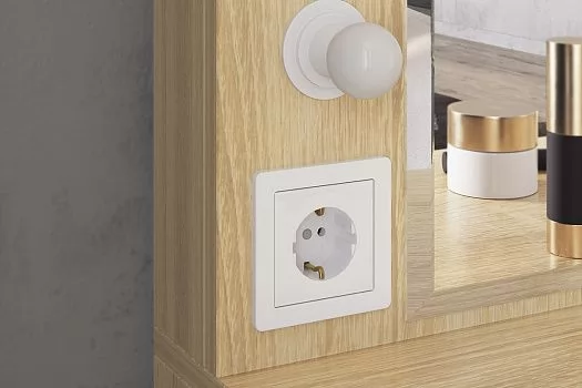 Состоит из зеркала с подсветкой, встроенного выключателя, розетки для фена, выдвижного ящика с бархатным вкладышем для украшений.